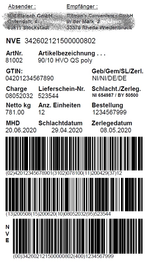- Transportetikett RINDFLEISCH (GTIN 128/NVE)
