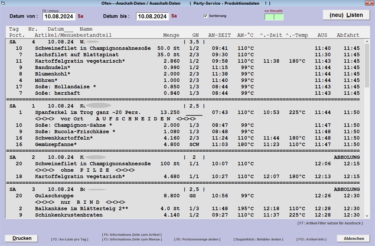 Party-Service-Auftragsliste (Liste von allen vom aktuellen Datum ab herzustellende Menues mit den relevanten Menue- und Kundendaten.)
