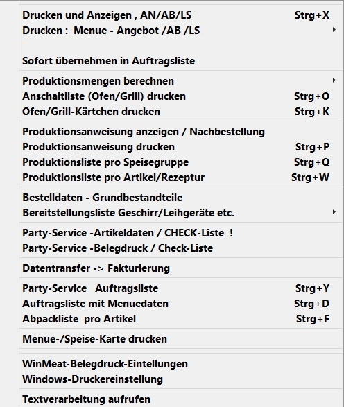 Die Kunden- und Artikelverwaltung greift direkt auf die Dateien der WinMeat-Stammdatenverwaltung zu. Der Datentransfer zur WinMeat-Fakturierung erlaubt neben den eigenen Belegdruckfunktionen den Ausdruck der Menues als formellen Auftragsbeleg und die Übergabe der Daten an die Statistik. Da die Übergabe als Bestellung erfolgt, können die Daten dort auch in die Berechnung zum Ausdruck der Gesamt-Produktionsplanliste des Auftragswesens für den nächsten oder folgende Tage eingehen. Angebote, Auftragsbestätigungen und Lieferscheine lassen sich aber auch direkt mit der eigenen Druckroutine des Party-Service-Beraters mit wählbaren Schriftarten und Schriftgrößen ausgeben.