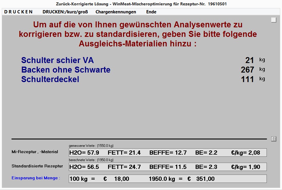 Standardisieren/Optimieren/Korrigieren Sie Ihre Wurstproduktion während des Herstellungsprozesses auf die gewünschten innerbetrieblichen Analysenwerte (s.u.)