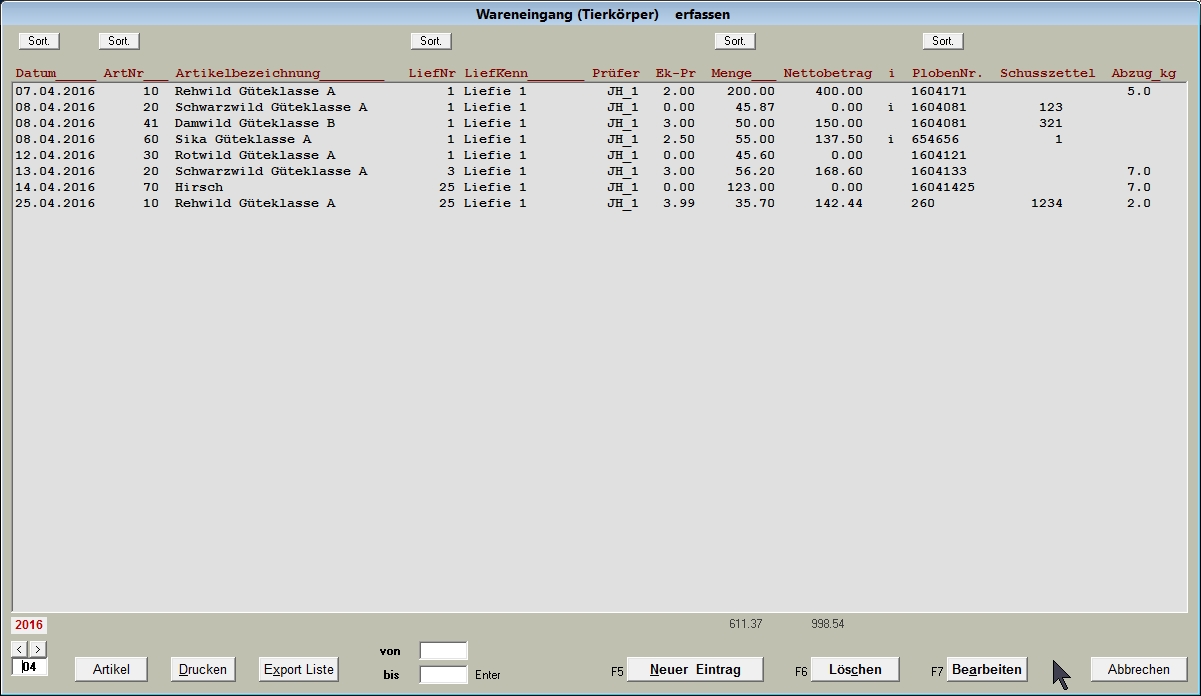 Wareneingangs-Statistik mit Filter : Lieferant + Artikel