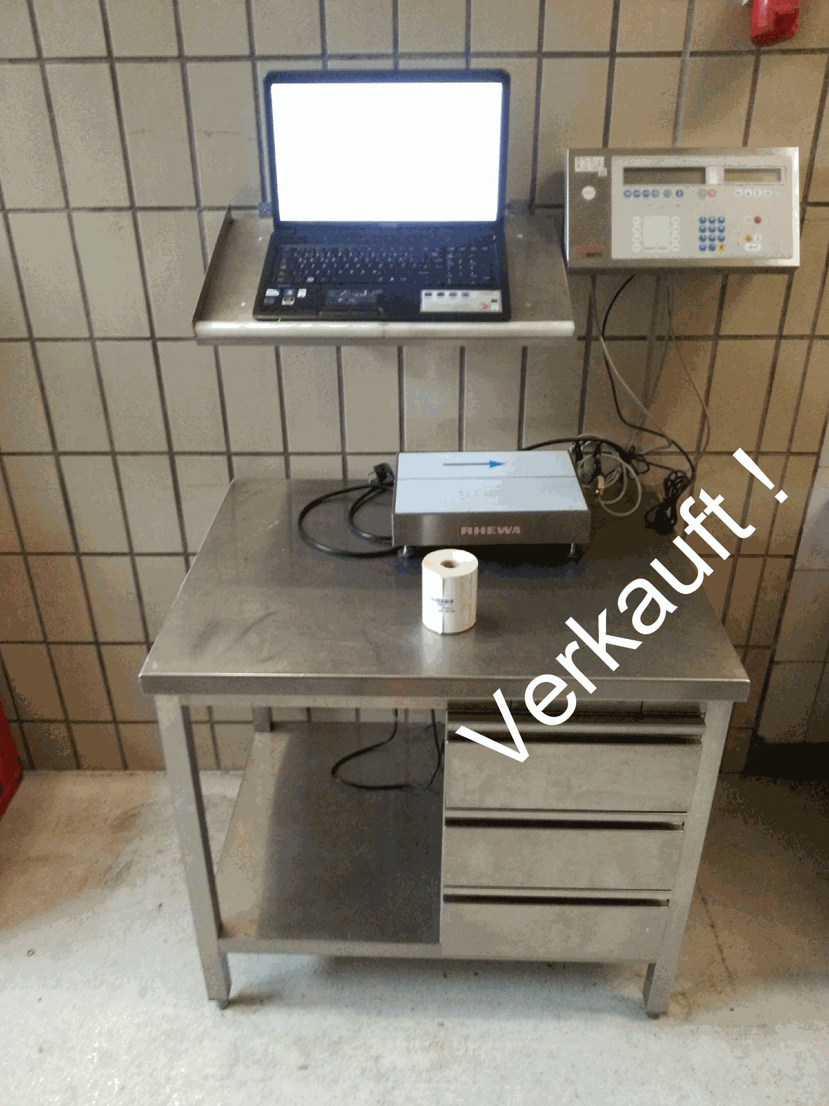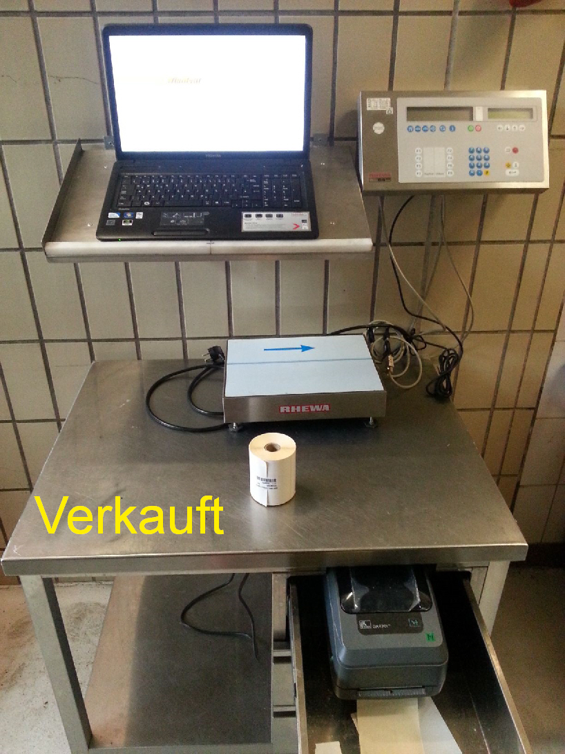 WinMeat Auftragswesen mit Waagenanschluss und Kalkulationsprogramme 17,3" Notebook mit Windows 7 Wägesystem mit Rhewa84-Anzeigegerät mit Albispeicher Desktop-Etikettendrucker (hier in oberster Schublade) Lieferschein-Ausdruck im Büro