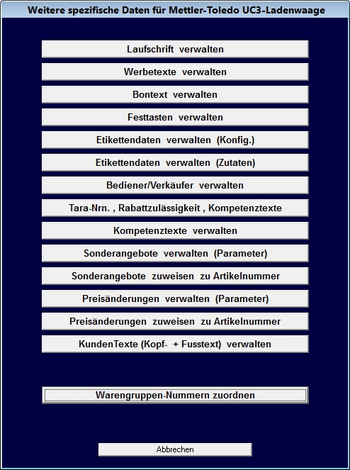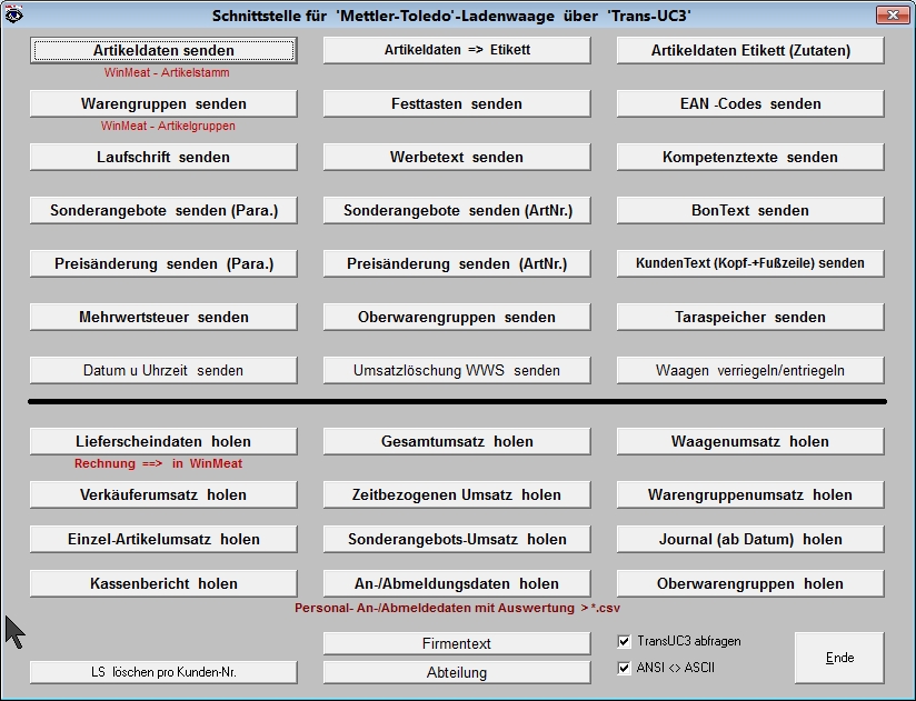 d) PLU-Artikeldaten und Preispflege und Umsatzholung von Mettler-Toledo LP-Ladenwaagen (DFÜ über Batch-Steuerung/“Trans-LP-Software“) , (+ weitere Funktionen wie Kompetenztexte, Etikettendefinitionen, Taravorgaben, Rabattzulässigkeit etc.)