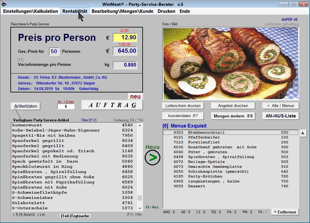 Die Kunden- und Artikelverwaltung greift direkt auf die Dateien der WinMeat-Stammdatenverwaltung zu. Der Datentransfer zur WinMeat-Fakturierung erlaubt neben den eigenen Belegdruckfunktionen den Ausdruck der Menues als formellen Auftragsbeleg und die Übergabe der Daten an die Statistik. Da die Übergabe als Bestellung erfolgt, können die Daten dort auch in die Berechnung zum Ausdruck der Gesamt-Produktionsplanliste des Auftragswesens für den nächsten oder folgende Tage eingehen. Angebote, Auftragsbestätigungen und Lieferscheine lassen sich aber auch direkt mit der eigenen Druckroutine des Party-Service-Beraters mit wählbaren Schriftarten und Schriftgrößen ausgeben.