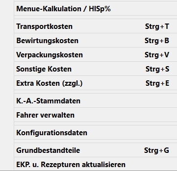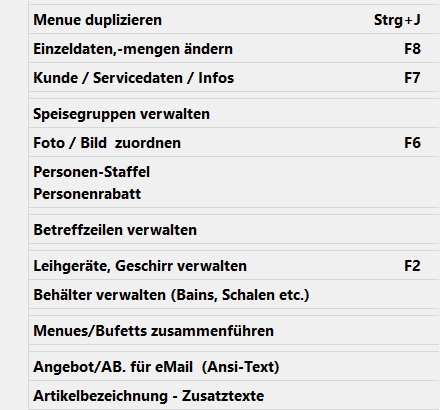 Menuebestandteile werden einfach über Befehlsschaltflächen hinzugefügt („Hinzu“) oder aus dem Menue wieder entfernt („Entf.“ ), aber auch in umfassenden Listenfunktionen bei Anzeige aller Einzeldaten bearbeitet/kalkuliert.