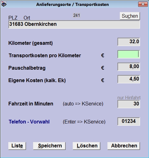 Menue : Stammdaten/Einstellungen________________________________________________________Transportkosten/Fahrtzeit